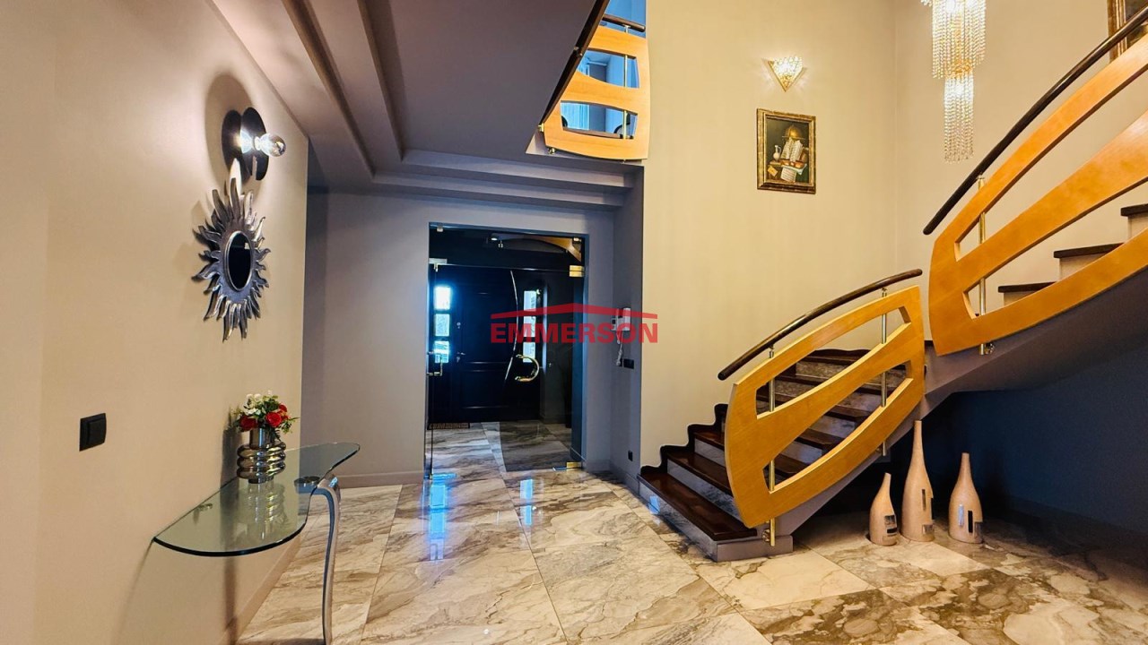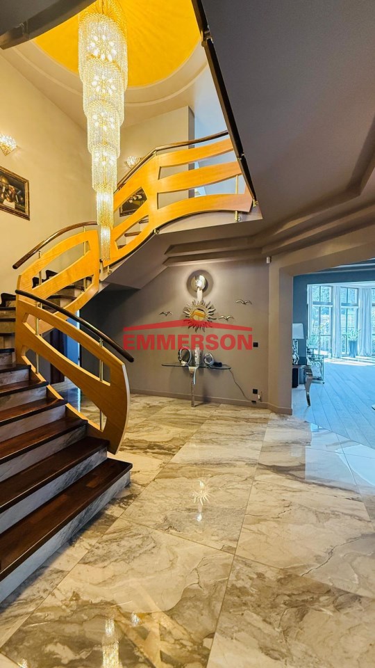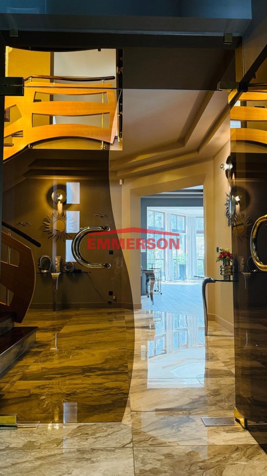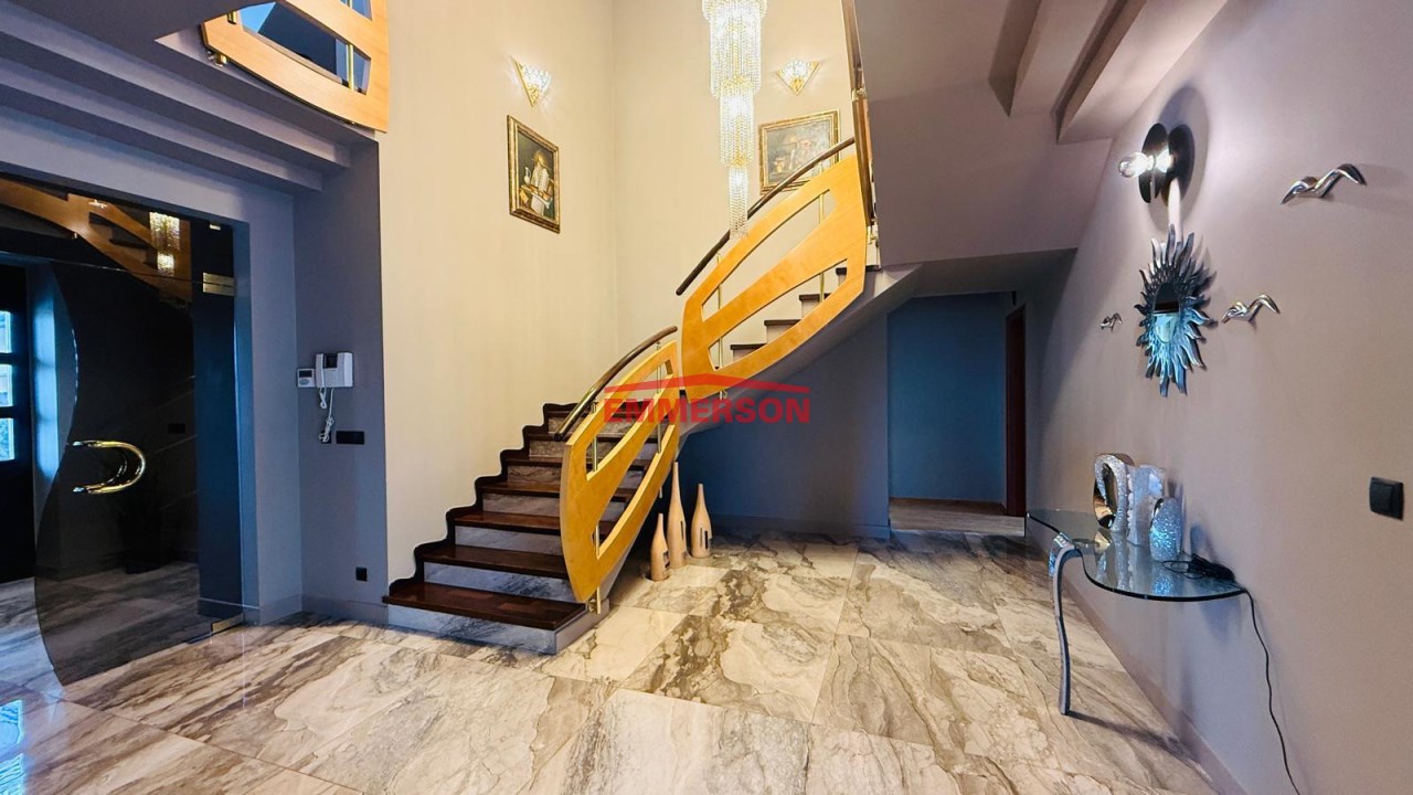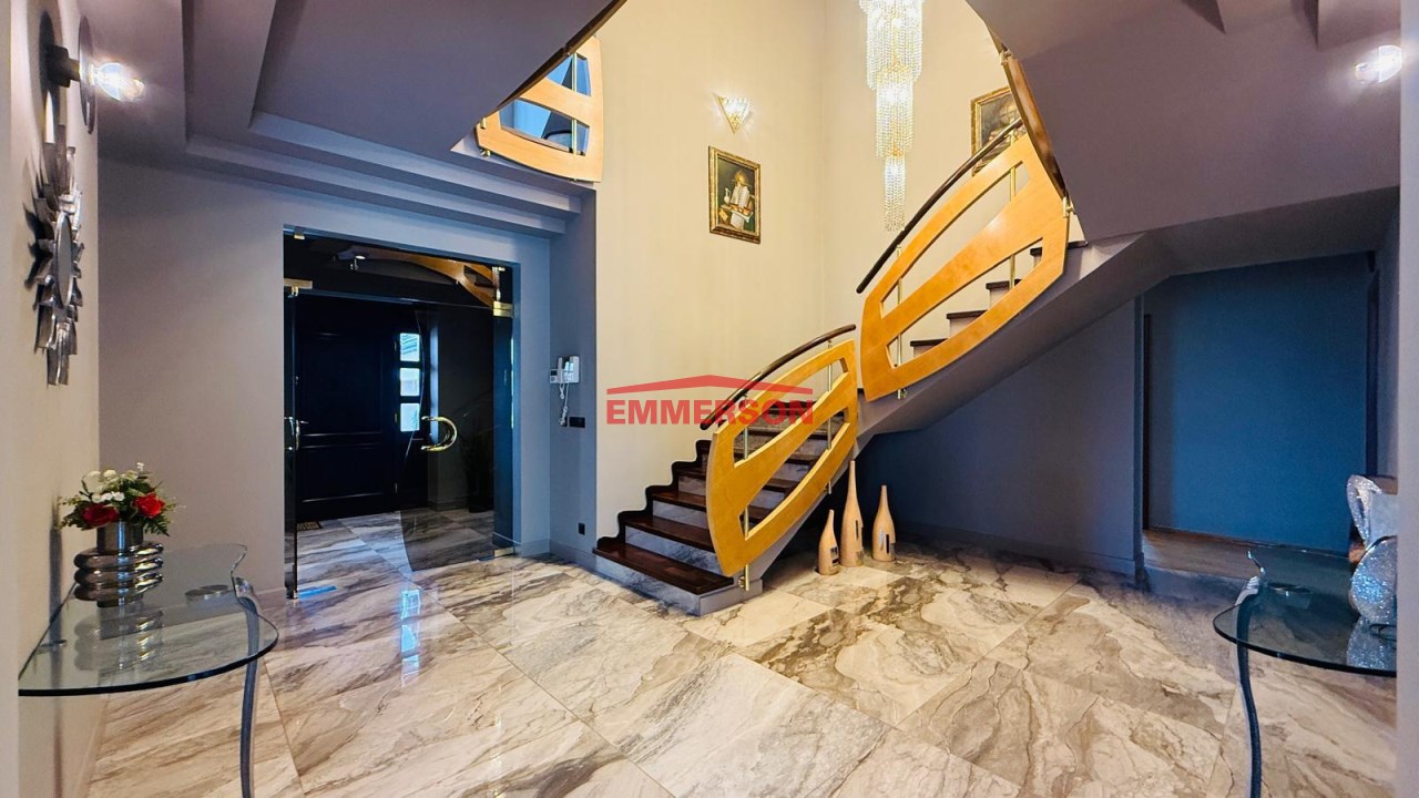Reprezentacyjny hol wejściowy z pięknymi schodami oraz oświetleniem, które na zamówienie zostało sprowadzone z Dubaju, prowadzącymi na piętro domu.