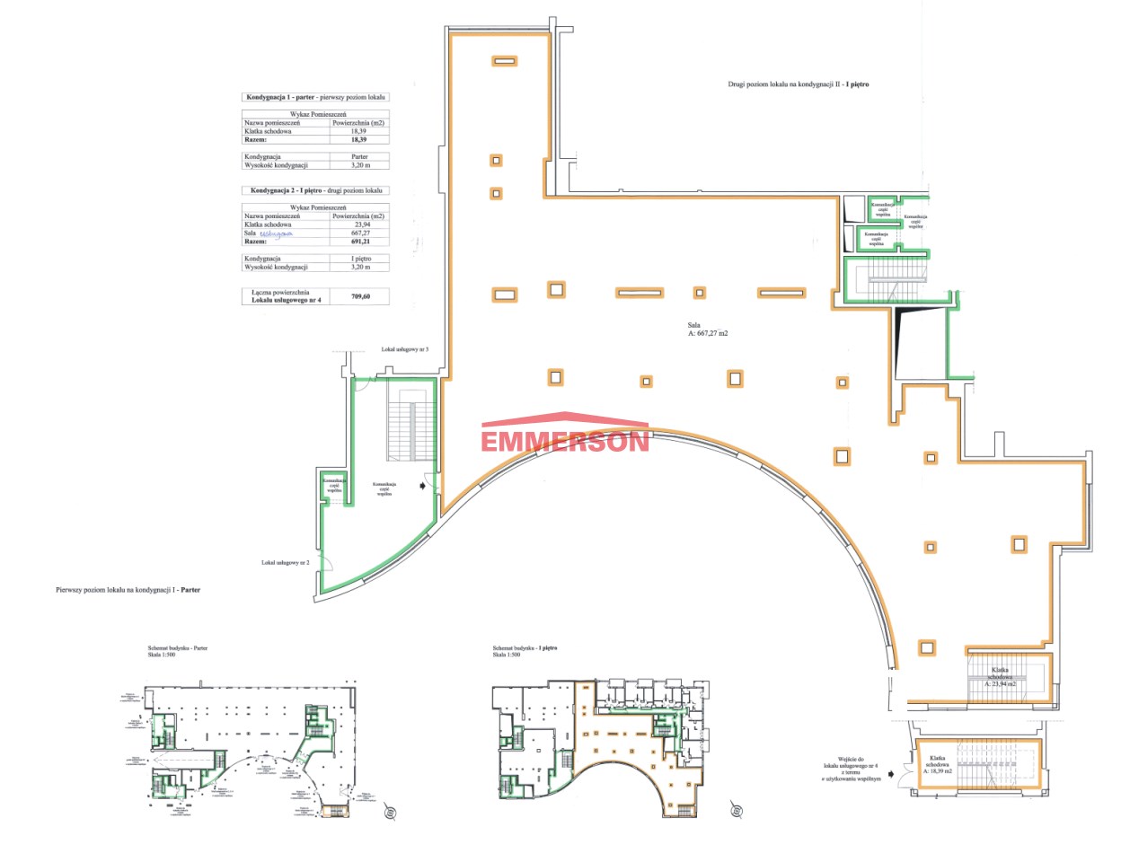 Powierzchnia stricte użytkowa 667 m2, pozostałe 43 m2 to własna klatka schodowa.