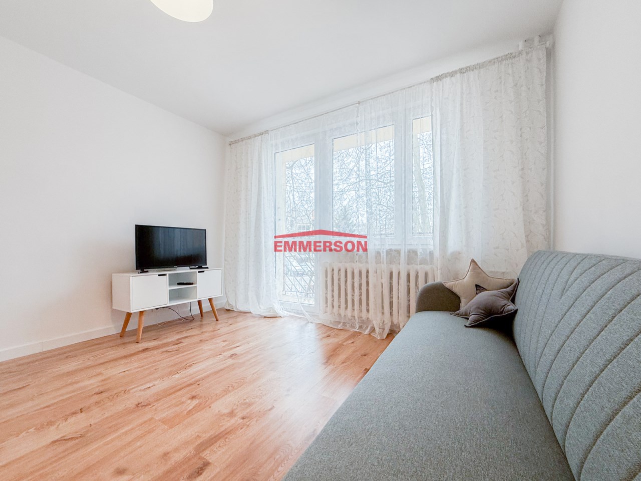 Mieszkanie dwustronne, od południa pokój dzienny z wyjściem na loggię, od północy ustawna sypialnia i jasna kuchnia, łazienka razem z wc. Nietypowy jak na parter widok z salonu i loggii, dzięki usytuowaniu budynku na wzniesieniu widać ładną panoramę, a przy dobrej przejrzystości nawet góry.