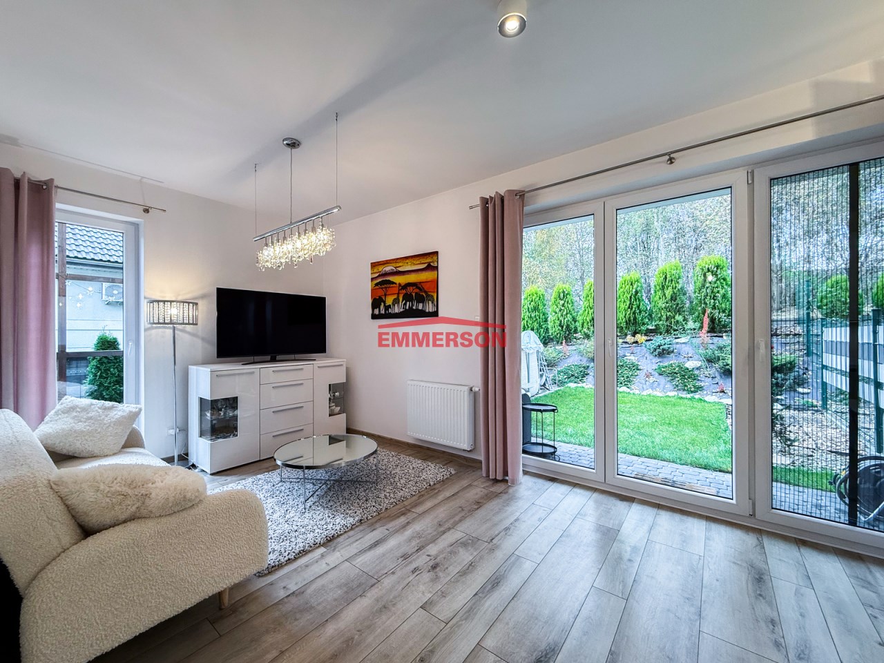 Z salonu wyjście na piękny ogród (około 85 m2). Doświetlony światłem słonecznym, strona południowo-zachodnia. Pełna zielona architektura.